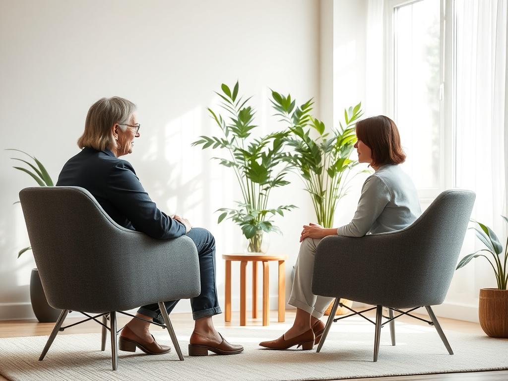 A cozy indoor setting featuring a coach and client engaged